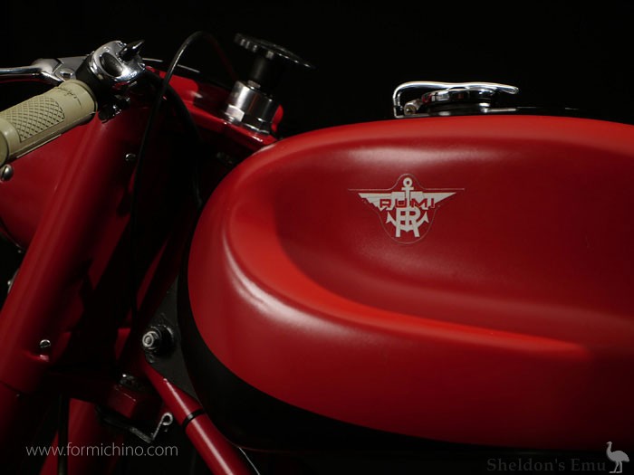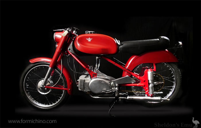 This model achieved quite a reputation in racing circles, and was campaigned by factory riders and privateers in the grueling Milano-Taranto and the Motogiri. It was known by several names but there were basically only two versions, one with 18mm Dellortos and the other sporting 22mm throats. In 1955 the cast iron barrels were replaced with K.S. alloy cylinders from the German Kolbenschmidt firm.