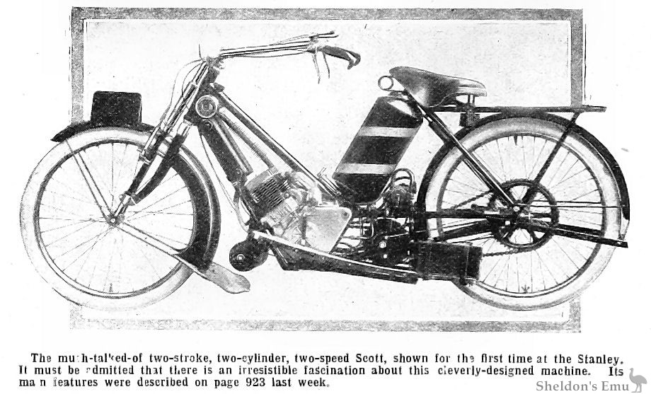 1901 Scott built his first engine. It was a twin-cylinder two-stroke, fitted to a Premier bicycle. It was mounted in front of the headstock and the front wheel was belt driven.