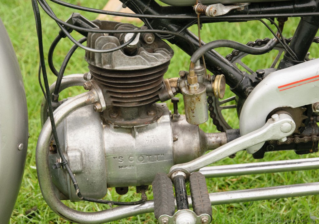 1953 A motorcycle carrying the Scott name and using the same engine, two-speed gearbox and shaft drive was shown at Earls Court. It had a loop frame, telescopic forks and plunger suspension, but nothing came of it.