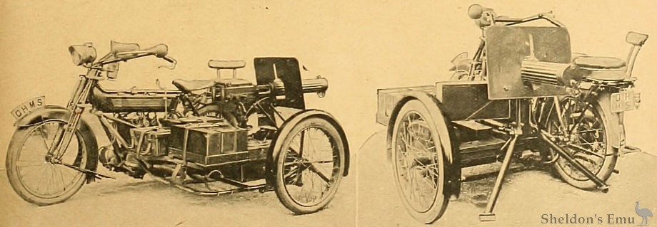 A large number of Scott and Enfield sidecars, to which the quick-firing guns are attached, are now being delivered. Their design is well-known to our readers. The principal features are as follow : Both machines are fitted with chain drive, two-speed gears, and twin-cylinder engines, the Scott engine being a two-stroke of 532 c.c.; the Enfield is fitted with a 6 h.p. J.A.P. 770 c.c. engine. That both are well-tried and reliable machines goes without saying, otherwise they would not have been selected for this very important work.