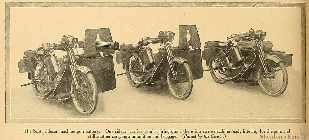 A MACHINE gun mounted on a motor cycle is no new thing - one was shown attached to a Scott bicycle at the Olympia Show two years ago - but its merits are now being recognised more than ever before. Batteries are being formed, consisting of sixty-four non-commissioned officers and men, who will be equipped with quick-firing guns mounted on Scott and Enfield sidecar machines. Every division of the Army is to have one of these motor machine gun batteries.
