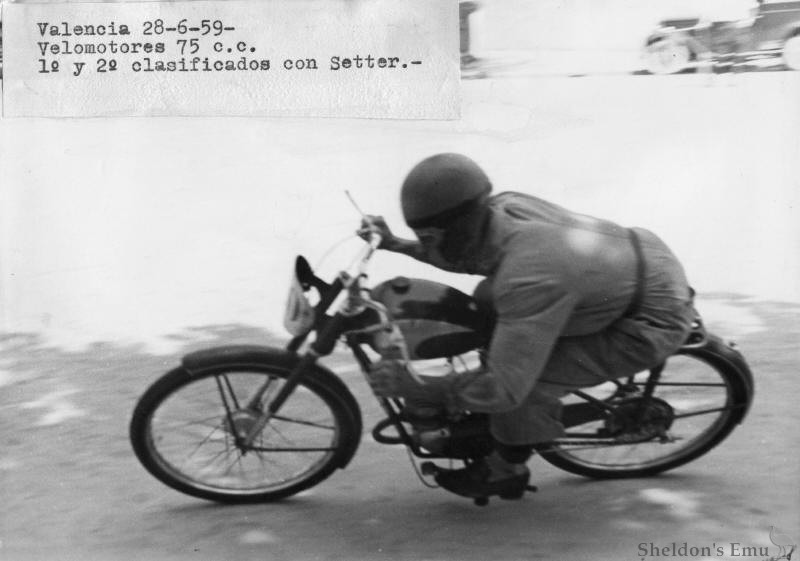 En una época en donde las carreras de motos no eran ni por asomo lo que ahora, las Setter competían en la categoría velomotor en casi toda carrera que tuviera lugar el levante español. Desde Castellón hasta Murcia, cosecharon meritorios puesto en especial desde el lanzamiento del modelo 74 cc del año 59. Sobre esta pequeña motocicleta, corredores que luego triunfaron con otras marcas: Ramiro Blanco, César Gracia, Enrique Escuder... o el piloto oficial de la casa: José Pascual, lograron gran cantidad de triunfos de los que a día de hoy quedan pocos recuerdos. Con algunas fotos y datos trataremos de avivar esos días.