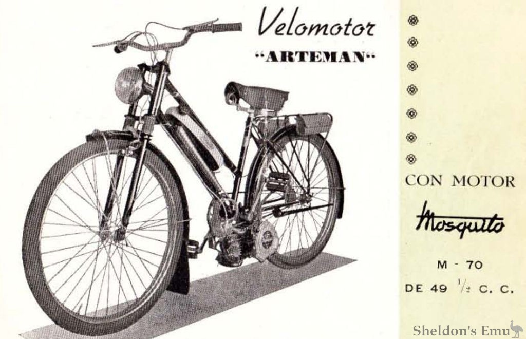 Miguel Arteman Cerdá of "M. Arteman SC" was the exclusive Spanish distributor of mopeds equipped with 49cc Mosquito two-stroke engines which delivered power via a friction roller to the rear wheel.