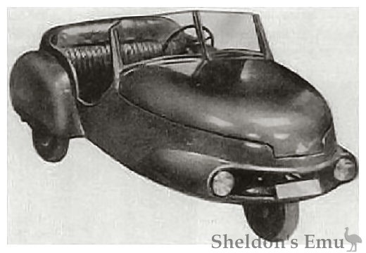 The brand resurfaced in 1939 building electric four-wheelers. Post-war they produced a variety of three-wheeled vehicles with a single front wheel powered by a 345cc two-stroke. Some were motofurgone style, others were rather sporty little convertibles, and there was a 5-wheel version. Between 60 and 75 were built, production ending in 1957.