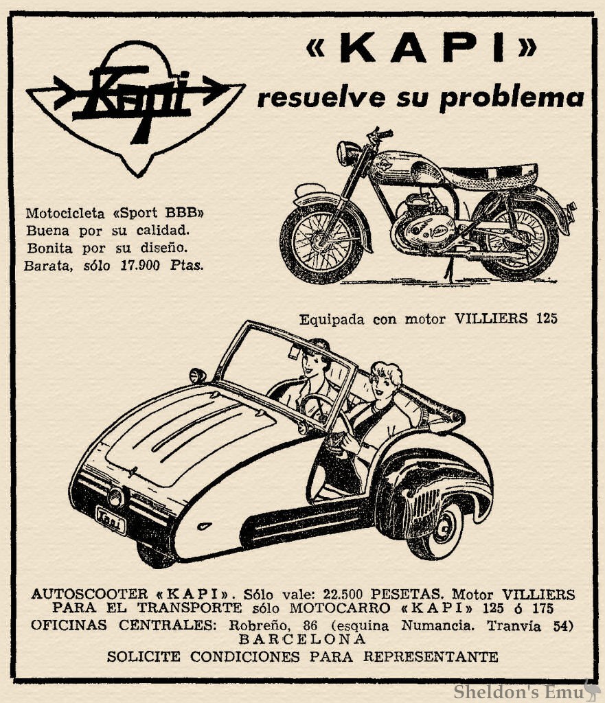 The Kapiscooter was introduced in 1951, a three-wheeler using 125cc Hispano Villiers and 175cc Fita AMC four-stroke engines.