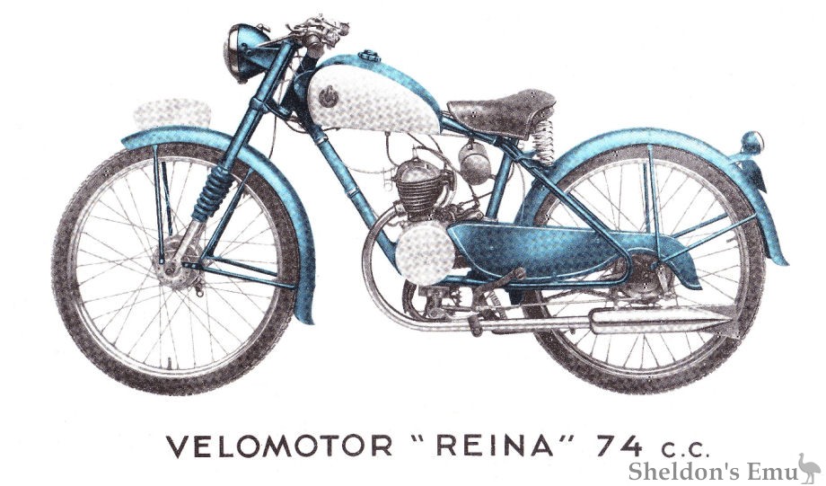 In 1955 and 1956 the Reina company built motorcycles and motocarros powered by Cucciolo, MYMSA, Villiers and its own engines. Located at 80-84 Mallorca Street Barcelona, the workforce included the manager, Antonio Casa and five others.