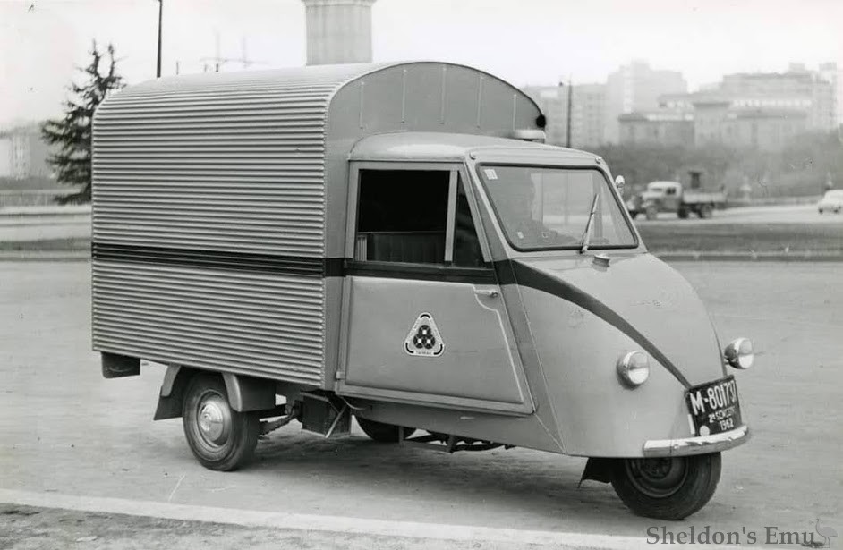 His firm produced commercial tricycles (motocarro) with enclosed cabins and typical microcar controls. These were powered by a LEW 250cc two-stroke engine which was closely based on the DKW design, and had a differential sourced from the Fiat Topolino.