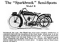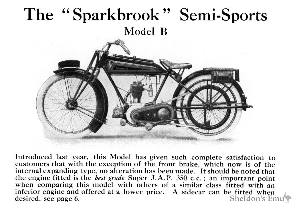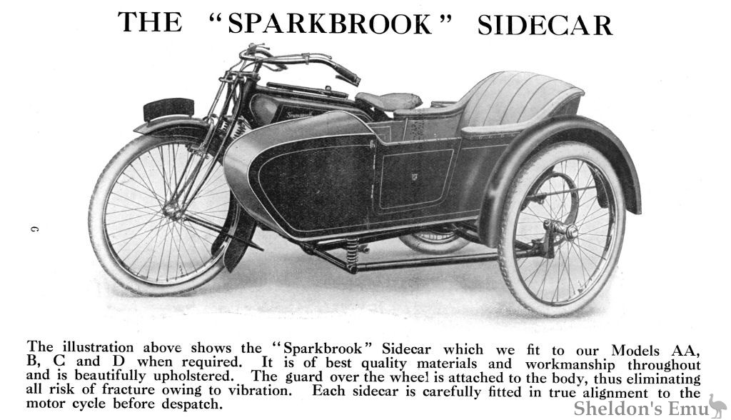 The illustration above shows the Sparkbrook" Sidecar which we fit to our Models AA, B, C and D when required. It is of best quality materials and workmanship throughout and is beautifully upholstered. The guard over the wheel is attached to the body, thus eliminating all risk of fracture owing to vibration. Each sidecar is carefully fitted in true alignment to the motor cycle before despatch.