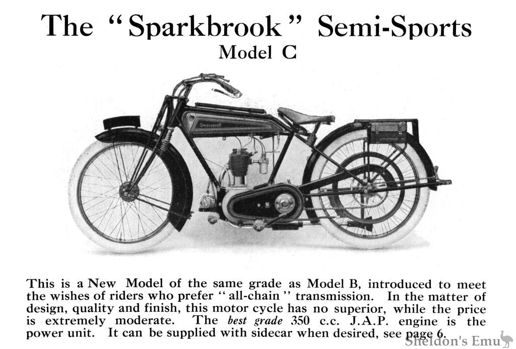 This is a New Model of the same grade as Model B, introduced to meet the wishes of riders who prefer " all-chain " transmission. In the matter of design, quality and finish, this motor cycle has no superior, while the price is extremely moderate. The best grade 350 c.c. J. A. P. engine is the power unit. It can be supplied with sidecar when desired, see Page 6.