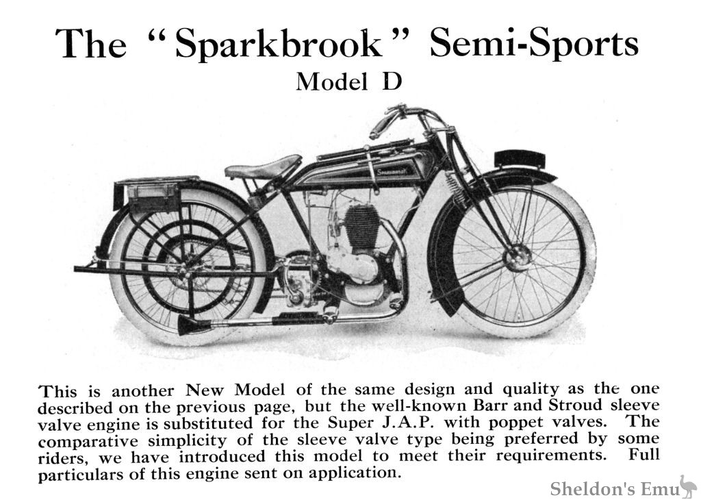 This is another New Model of the same design and quality as the one described on the previous page, but the well-known Barr and Stroud sleeve valve engine is substituted for the Super J. A. P. with poppet valves. The comparative simplicity of the sleeve valve type being preferred by some riders, we have introduced this model to meet their requirements. Full particulars of this engine sent on application.
