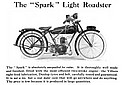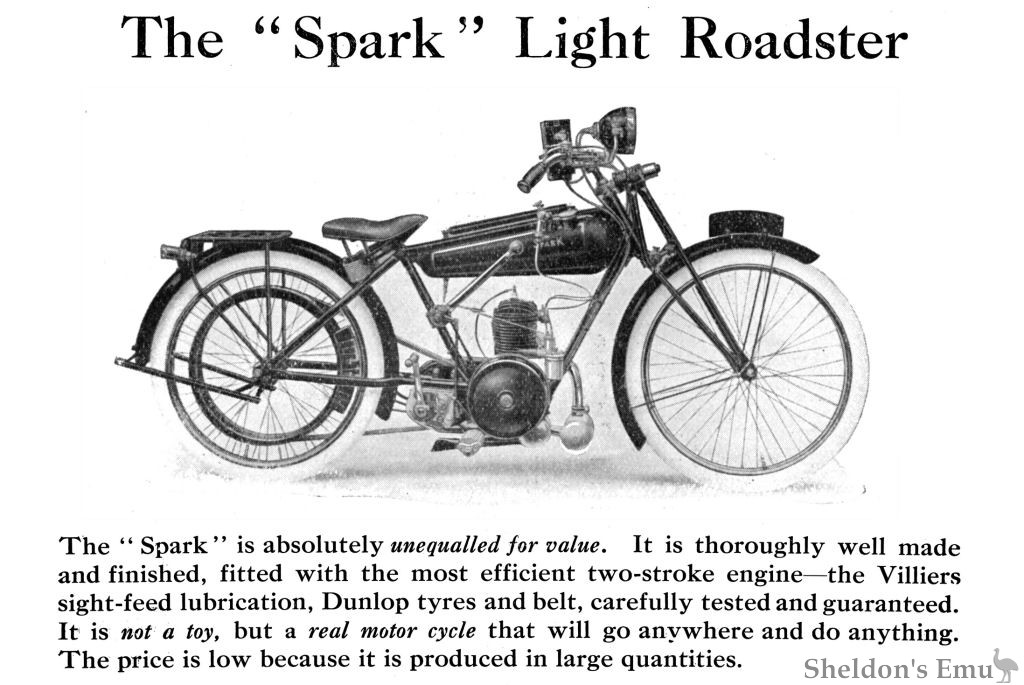 The " Spark " is absolutely unequalled for value. It is thoroughly well made and finished, fitted with the most efficient two-stroke engine - the Villiers - sight-feed lubrication, Dunlop tyres and belt, carefully tested and guaranteed. It is not a toy, but a real motor cycle that will go anywhere and do anything. The price is low because it is produced in large quantities.