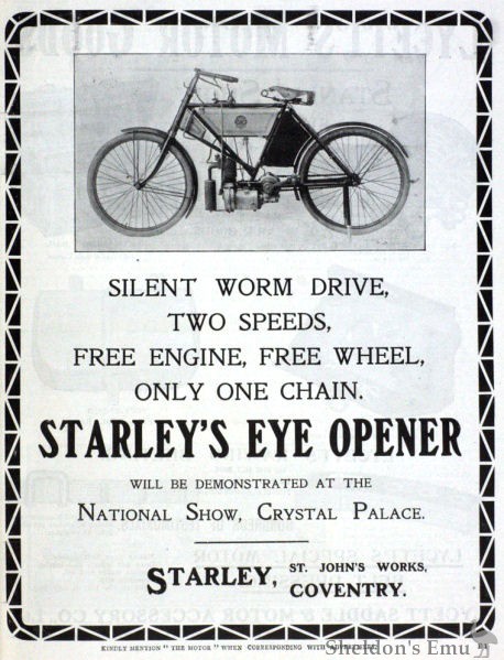 1903 Starley was a motorcycle invented by W. Starley of Coventry (presumably William Starley), and built under licence by the Swift Motor Co. It was shown on Houk's stand at the 1902 Stanley Cycle Show.