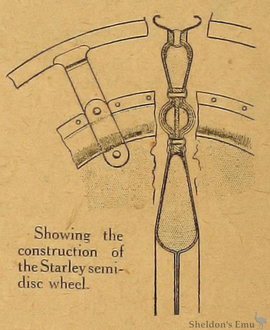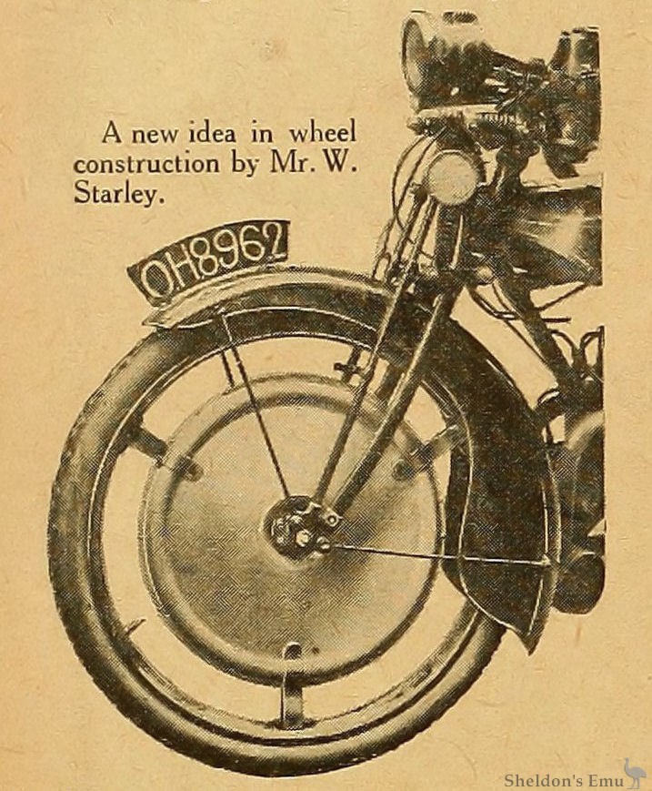 As the invention of the originator of the tangent cycle wheel, the latest motor cycle wheel produced by Mr. W. Starley (1) is worthy of special attention, particularly as many of the advantages claimed are not obvious unless the construction is carefully studied. In the main, the wheel consists of two discs of aluminium spun to such a form as to give lateral rigidity. Close to their periphery these discs, when riveted together, form a circle of tubular section, in which are mounted three steel straps, which are held rigidly to the discs by outer metal strips, and form the sole contact between the disc and wheel rim.