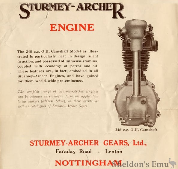 The 248 c.c. O.H. Camshaft Model as illustrated is particularly neat in design. silent in action, and possessed of immense stamina, coupled with economy of petrol and oil. These features are, in fact, embodied in all Sturmey-Archer Engines. and have gained for them world-wide pre-eminence.