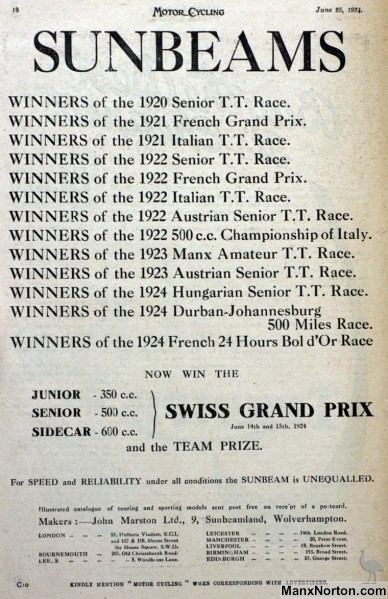 1922 Two new models were produced - one of which was to remain on the lists into the next decade. Alec Bennett, riding a Sunbeam, won the Senior TT easily - the first of five wins.