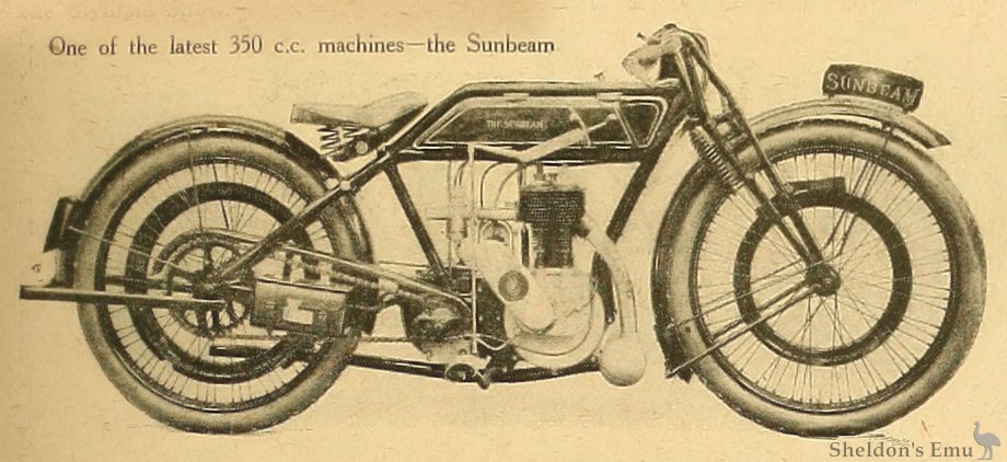 The type that won both the T.T. and the great French race at Strasbourg this year, with long-stroke engine (77 x 105) is on view; and much interest is also shown in the recently introduced 347 c.c. lightweight, which incorporates all the well-known refinements of the larger models, such as oil-bath chain cases, powerful brakes operating on dummy belt rims both front and rear, and the Sunbeam three-speed gear. Sunbeam enthusiasts and motor cyclists in general will welcome the reappearance of this model in its present advanced form.