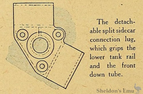 Several minor alterations have been made to the Sunbeam sidecar chassis. The current model has three-point attachment at the front by means of straight tubes, one from the footrest bolt and two from the front tube. The 1922 design eliminates the straight tubes, one tube only being used at the front, and this is curved, being attached to the cycle frame by a neat split lug, which grips the lower tank rail and the front down tube. A single bolt is used, but in order that the clip remains in place when the sidecar connection is withdrawn, three small bolts are embodied to retain the lug in position.