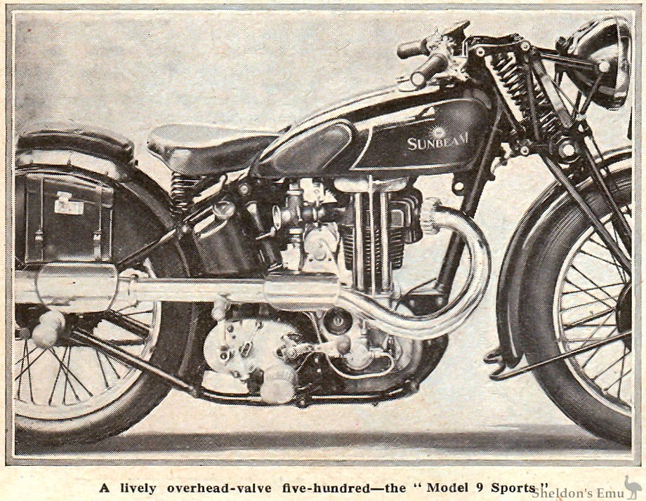 500 c.c. Model 9.—493 c.c. single-cyl. o.h.v. Sunbeam; dry-sump lubrication; magneto ignition; all-chain drive; oil-bath primary chain case; 4-speed gear with loot control; fuel, 3 gals.; 26x3.25in. tyres.