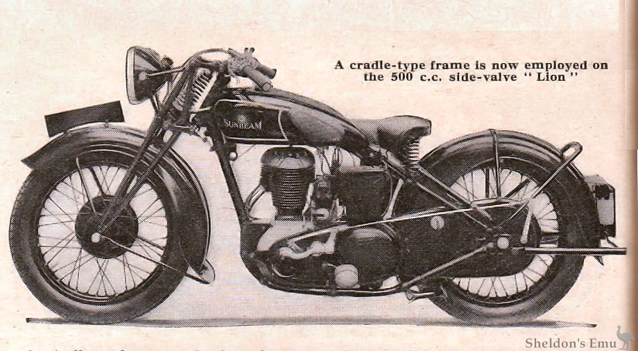 Two popular favourites are to be found in the 600 c.c. “Lion” side-valve long- stroke and the 600 c.c. o.h.v. Model 9. These two models have been little changed since last year. Both have the well-tried Sunbeam diamond-type frame, and the specification includes a constant- mesh gear box in which the drive is transferred to the off side. On both these machines it :s possible to fit the standard oil-bath rear chain case as in the past.