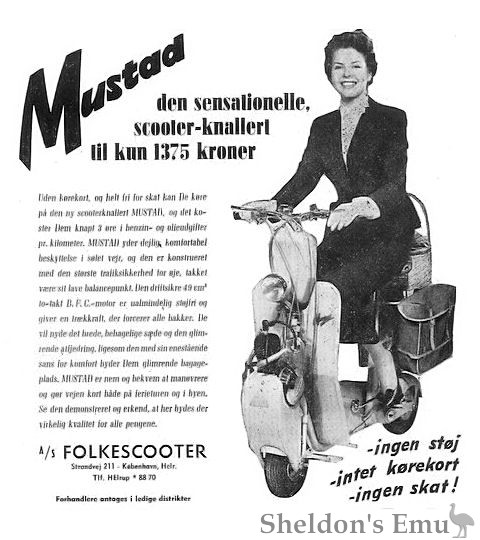 Under licence, it appears, the Mustad scooter was also produced by A/S Folkescooter, København, Hellerup in Denmark and Sports Firmæt GRESVIG, Oslo in Norway. The Danes used a BFC engine, the others an AMO.