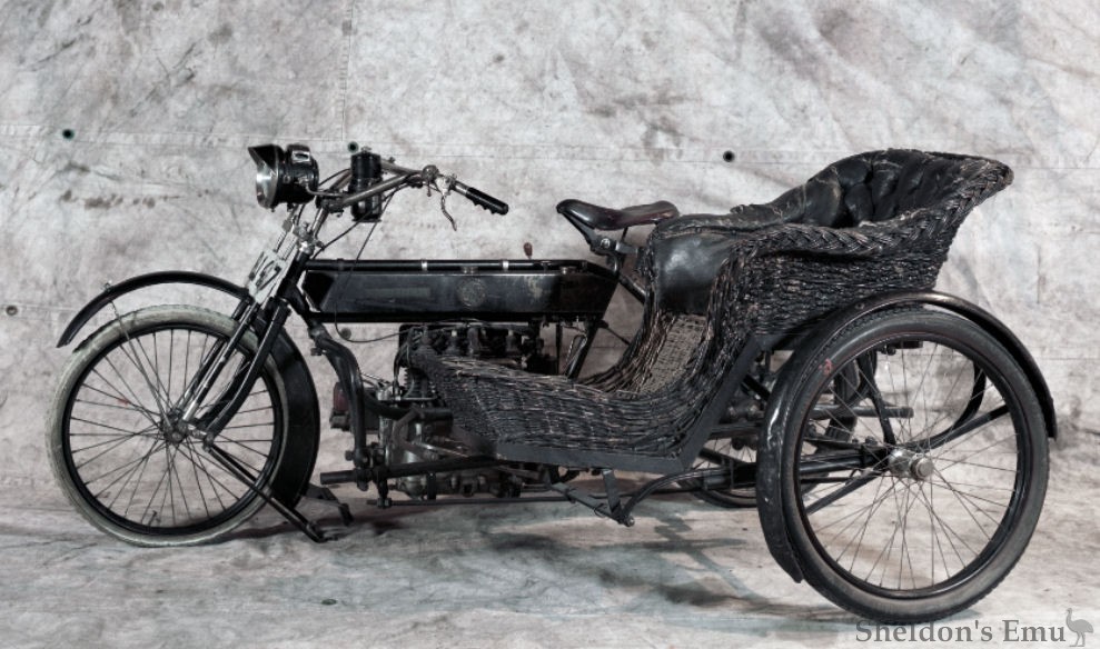 These were lightweights using an inclined engine, with an optional clutch introduced in 1912. The 1912 version had a large cylindrical brass tank, belt drive and pedals, rim brake acting on the belt sprocket, and rudimentary front suspension. Four examples remain, at least one of which has beautifully restored.