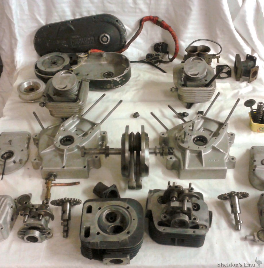 I sorted and cleaned all the major stuff and laid it out for a photo. Light in the shed is rubbish today. The engine is all there, except for a few screws and nuts that were in a rust ball at the bottom of the box. Last ran in 1989, dropped the ex valve seat on the back head. Made an effort about 10yrs ago, had the cases vapour blasted and fitted new bearings. Had the crank rebuilt at NEB with all new custom made b/end. No gearbox.