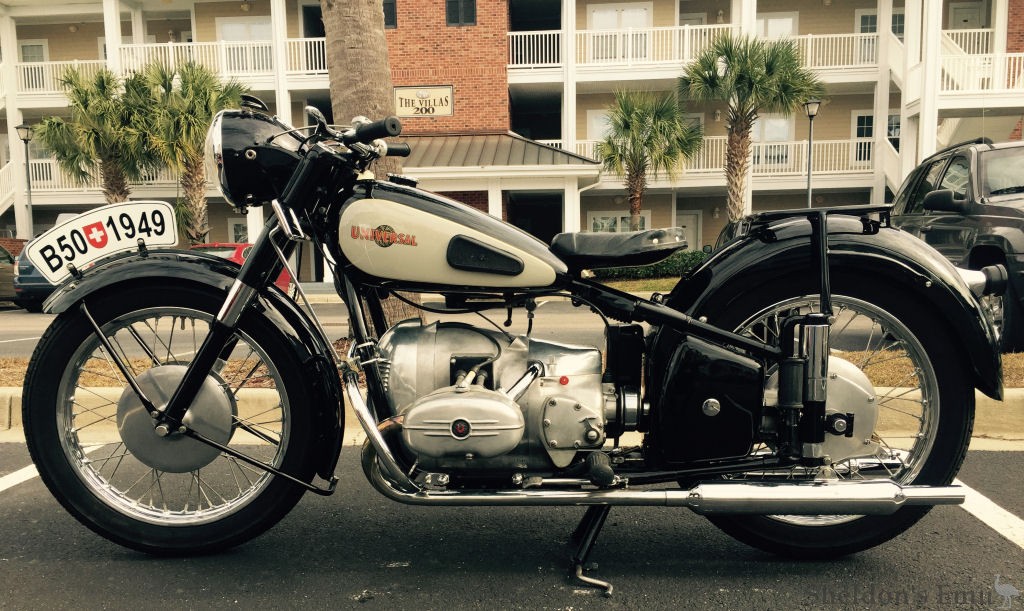message: I purchased a 1955 Swiss Universal motorcycle back in 1972. It was a mirror image of a BMW R50/2. The front engine cover was stamped aluminum - not cast aluminum. It came with a manual that was in 4 languages (I believe it had german, french, italian and spanish), none of which was english. I have not been able to find any information on this type of motorcycle since I sold it to help pay for collage. Have you heard of it or have any information about this type of motorcycle?
