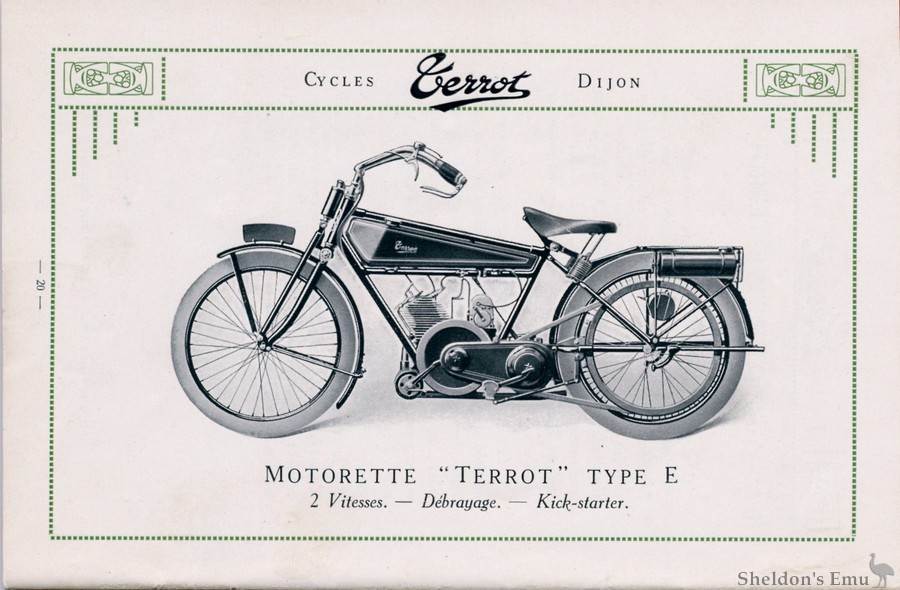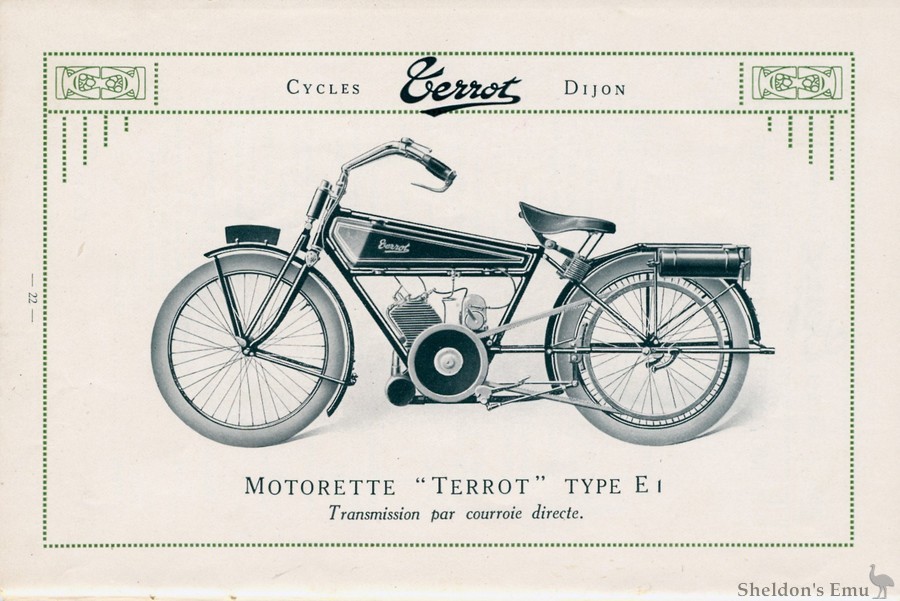 Moteur Terrot 2 temps, 70x70 2 HP 3/4. Magneto : haute tension a avancc variable. Carburateur: semi-aulomatique. Siiencieux: echappement litre facul-tatif. Graissage : par melange d'huile dans 1'essence. Transmission : mixtc par chaine et courroie. Boite de vitesses : botte Terrot a deux vitesscs. Embrayage: par friction de lieges sur flasques metalliques. Commande au pied. Mise en marche : par pedale se repliant dans le plan de la machine. Frcins : a main et au pied sur poulies arrierc. Suspension : fourche elastique Terrot oscillante. Roues : 600 x 55.