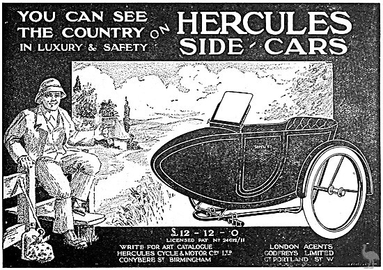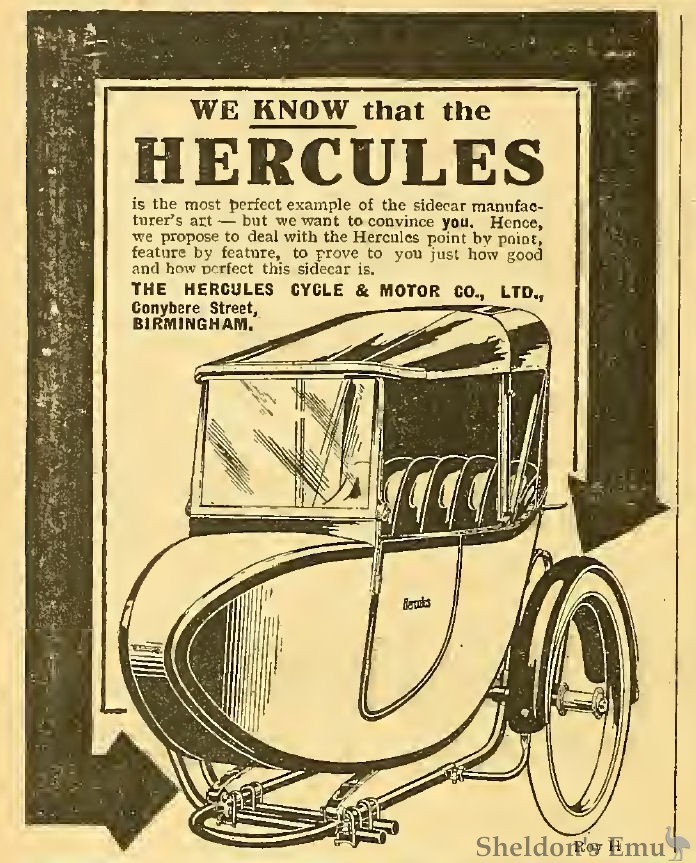 1912 They began advertising Hercules sidecars with the address given as Britannia Works, Coventry Street. Bicycle production had more the doubled, and the company moved to larger premises in Conybere Street, Highgate where the workforce was increased.