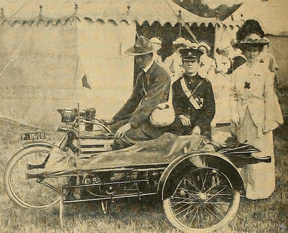 The Gloria sidecar ambulance attached to a Triumph motor bicycle. Standing on the right of the machine is Lady Rowley, who is said to have originated the idea of a motor cycle ambulance.