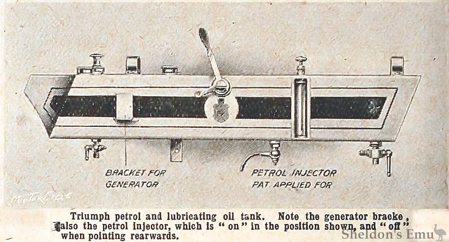 Triumph petrol and lubricating oil tank. Note the generator bracket, also the petrol injector, which is "on" in the position shown, and "off" when pointing rearwards.