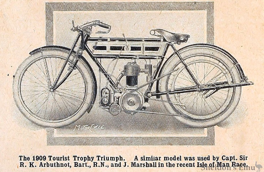 The 1909 Tourist Trophy Triumph. A similar model was used by Capt. Sir R. K. Arbuthnot, Bart., R.N., and J. Marshall in the recent Isle of Man Race.
