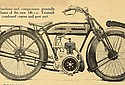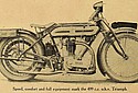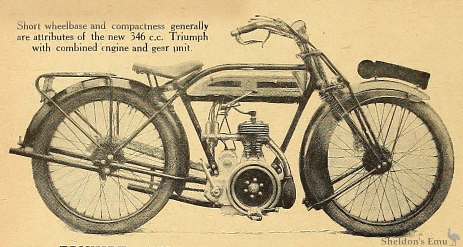 All Electrically Equipped.2¾ H.P. Model. 72x85 mm. (346 c.c): single cyl. four-stroke; side valves; mechanical lubrication. Triumph carb.; gear-driven mag.; 3-sp. gear; clutch and kick-starter; gear and chain drive; 26x2½in. tyres. Price; Solo, not fixed.