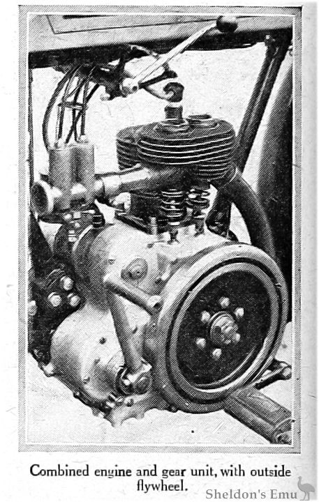 From the main shaft of the gear a bronze idle wheel carries the drive to an M-L magneto mounted directly behind the cylinder, and a kick-starter is, of course, incorporated with the unit.