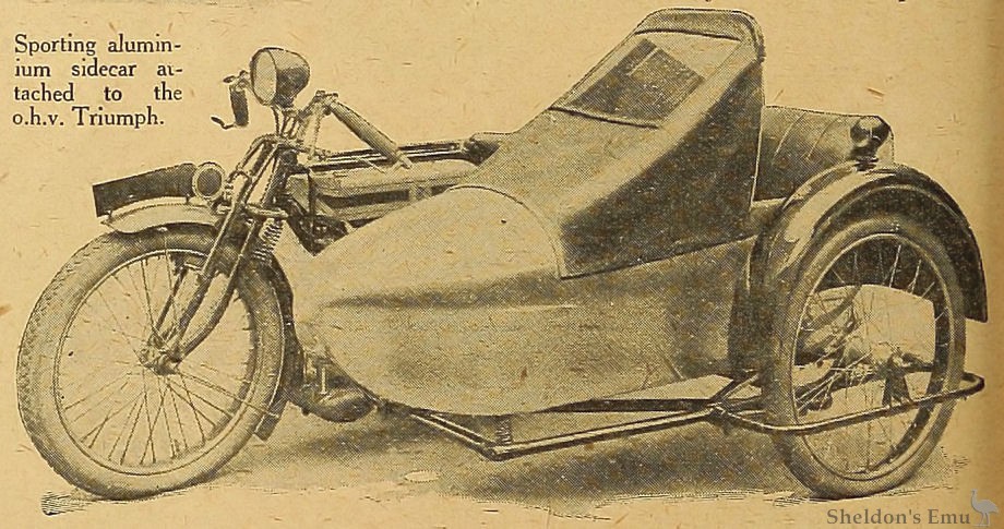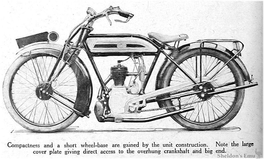 85x97 mm. (550 c.c); single cyl. four-stroke; side valves; hand pump lubrication; Triumph carb.; chain-driven mag.; 3-sp. gear.; clutch and kick-starter; chain drive; 26x3in. tyres. Price: Solo, £93 10s.; with Sidecar, £121 2s. 6d.