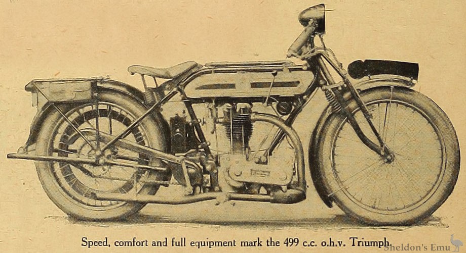80.94x97 mm. (499 c.c); single cyl. four-stroke: o.h.v. (4) valves; hand pump lubrication; Triumph carb.; chain-driven mag.; 3-sp. gear; clutch and kick-starter; chain drive; 26x3in. tyres. Price: Solo, £96 10s.; with Sidecar, £125 12s. 6d.