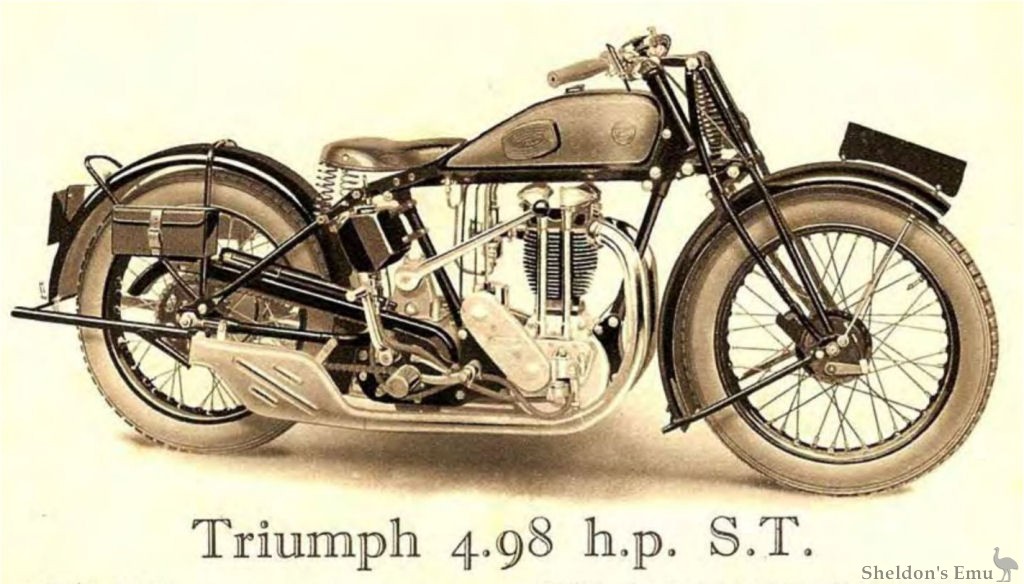 The Model TT continued for the 1928 season, unchanged apart from a Doherty quick-action twist grip being a standard fitting and the fuel tank changing, with all other 1928 models, to the new colours of black with saxe blue (sky/pale blue) panels. Also, the previous nickel-plated wheel rims became gold-lined black. Most Triumph models had their flat-tanks replaced by saddle tanks for 1929, and the Model TT was no exception and was renamed as the Model ST (Saddle Tank). It is believed that approximately 450 model ST's were produced, unsurprising really considering the economic situation and that these were bound for competition.