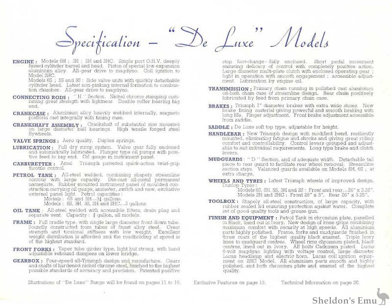 FINISH AND EQUIPMENT : Petrol Tank in chromium plate, panelled in Black, lined out in Ivory. New design of knee grips combining maximum comfort with security at high speeds. All aluminium parts highly polished. Frame, forks and mudguards finished in three coats of the highest quality black enamel. Triple Ivory lines to mudguard centres. Wheel rims chromium plated, black centres, lined out in Ivory. All bolts Cadmium plated. Lucas 6-volt magdyno lighting with voltage control, large diameter Lucas headlamp and electric horn. Lucas coil ignition equipment on 2HC Model. All aluminium parts smooth and highly polished, and both chromium plate and enamel of the highest quality