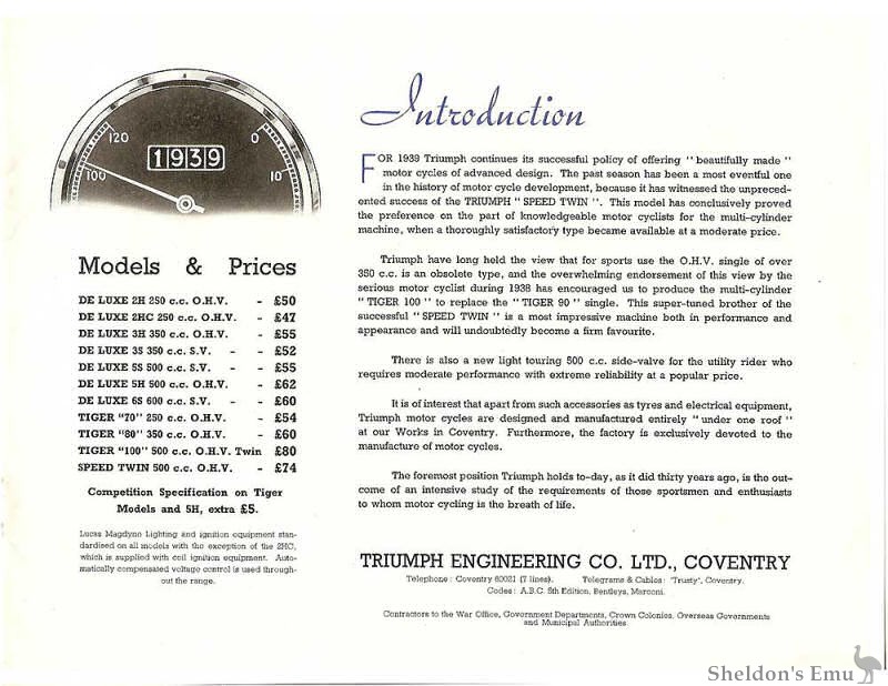 FOR 1939 Triumph continues its successful policy of offering "beautifully made" motor cycles of advanced design. The past season has been a most eventful one in the history of motor cycle development, because it has witnessed the unprecedented success of the TRIUMPH "SPEED TWIN This model has conclusively proved the preference on the part of knowledgeable motor cyclists for the multi-cylinder machine, when a thoroughly satisfactory type became available at a moderate price.