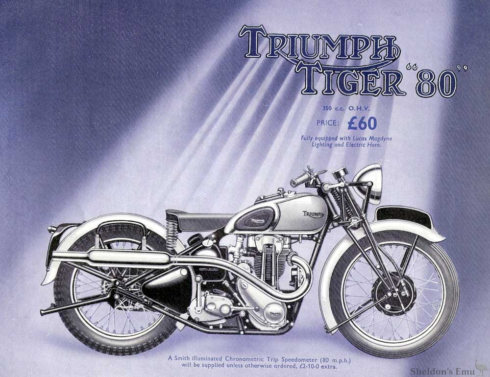 ENGINE : Single-port O.H.V., high efficiency units of advanced design individually tuned and Heenan and Fronde brake-tested, dismantled, inspected and re-assembled by expert mechanics Tiger "80" bore and stroke 70 mm. by 89mm. 343 c.c. Tiger "70" bore and stroke: 63 mm. by 80 mm.. 249 c.c. All-gear drive to Magdyno highly finished cylinder barrel, deeply finned. Cylinder head of efficient design, highly polished to correct contours, piston of special alloy - choice of high or low compression.