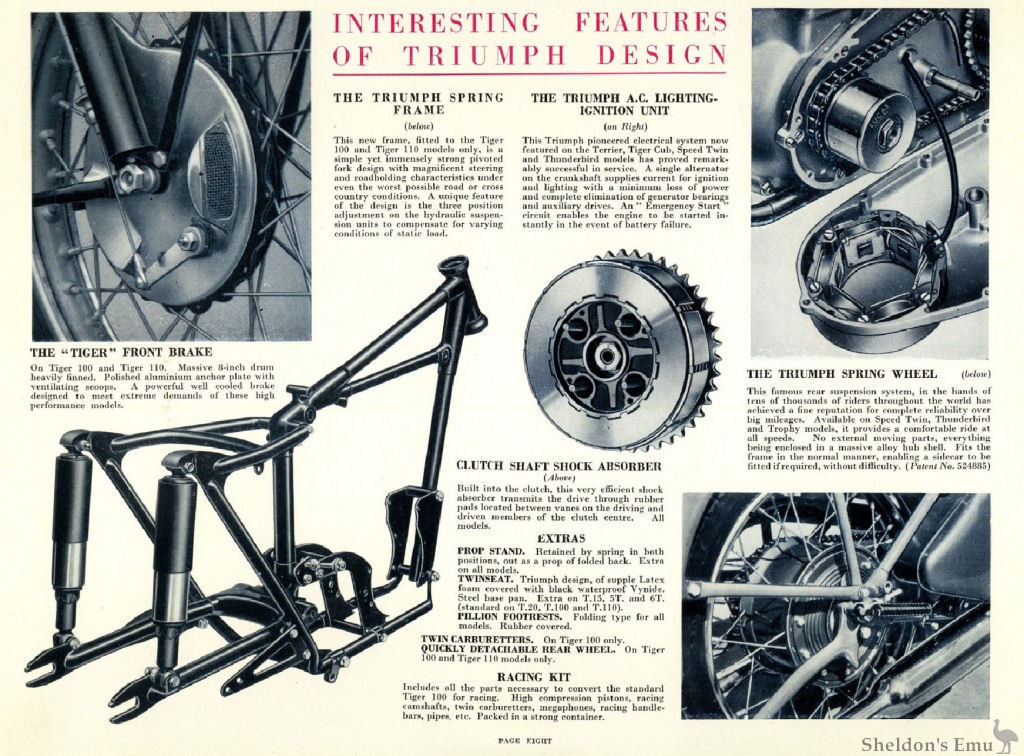 Now, Triumph offers, in addition to a range of brilliant twins, a new conception of lightweight design and performance in the "Terrier" and "Tiger Cub" models, which yet again emphasise the technical superiority of the Triumph product.