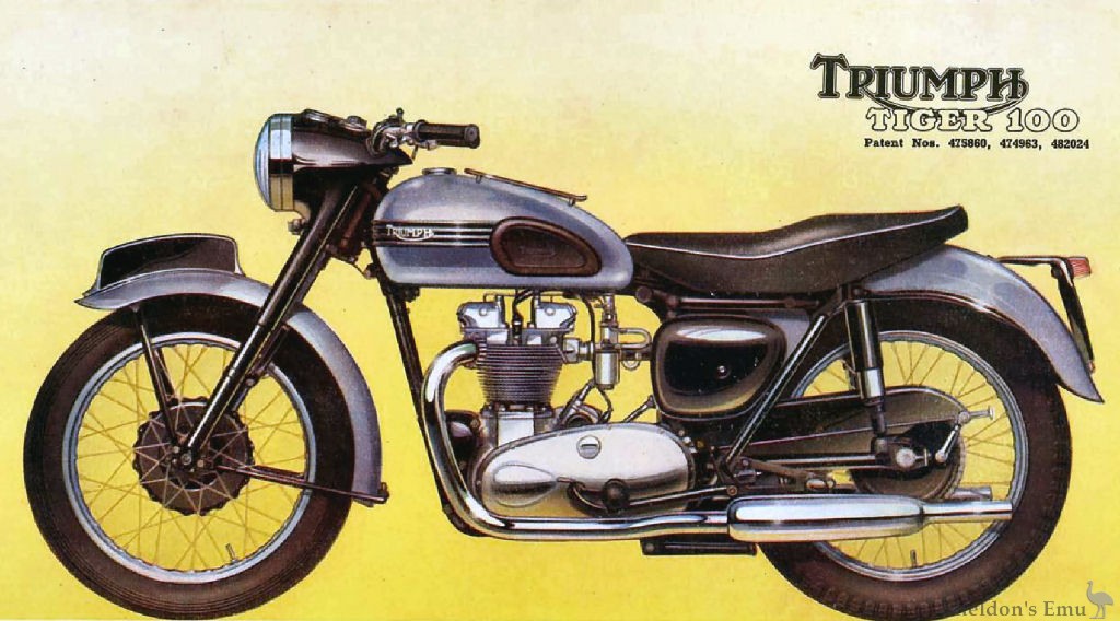 Famous for its performance in all fields of motorcycle activity, the Triumph "Tiger 100" has everything the enthusiast demands - speed, acceleration, brakes, suspension - plus the sleek good looks expected of a real thoroughbred.