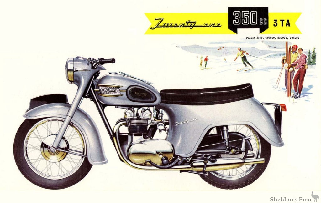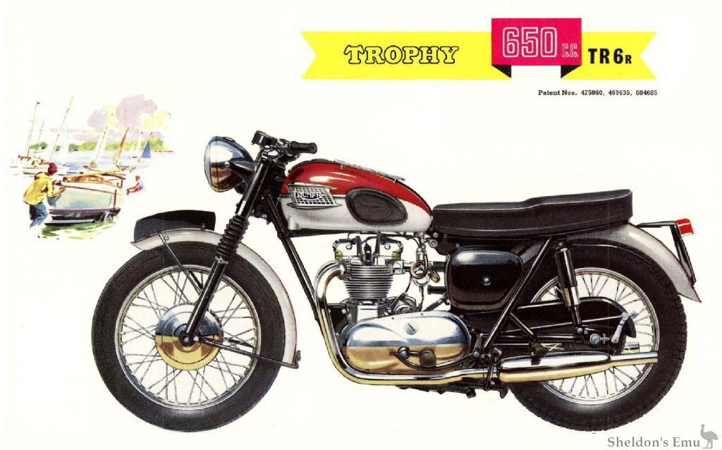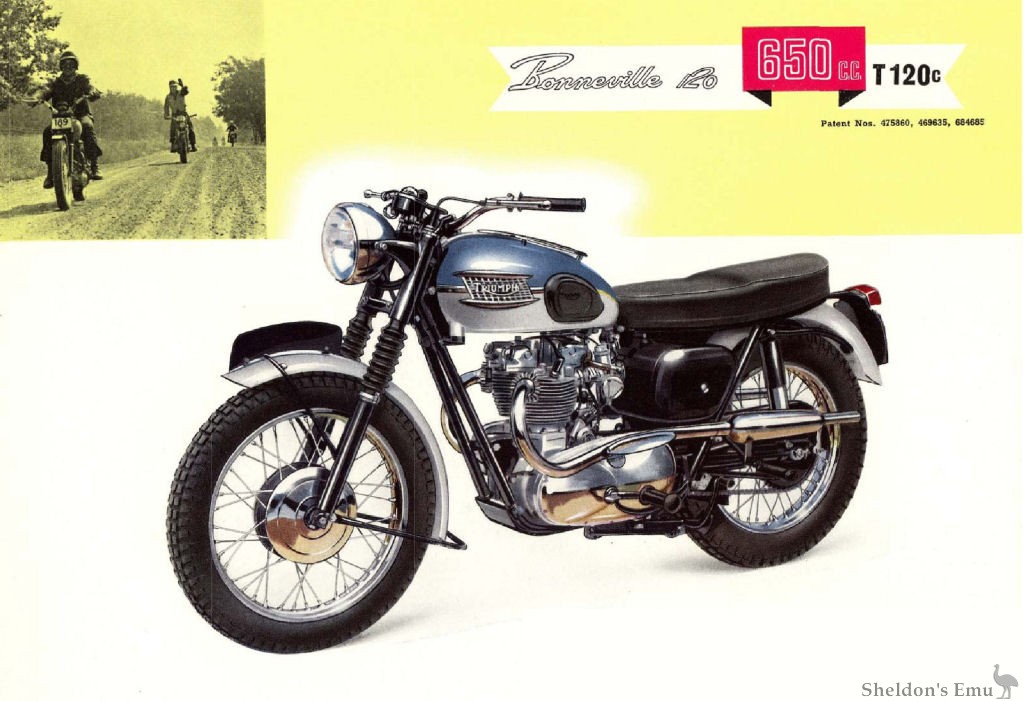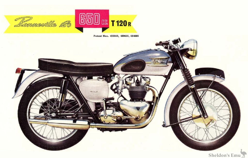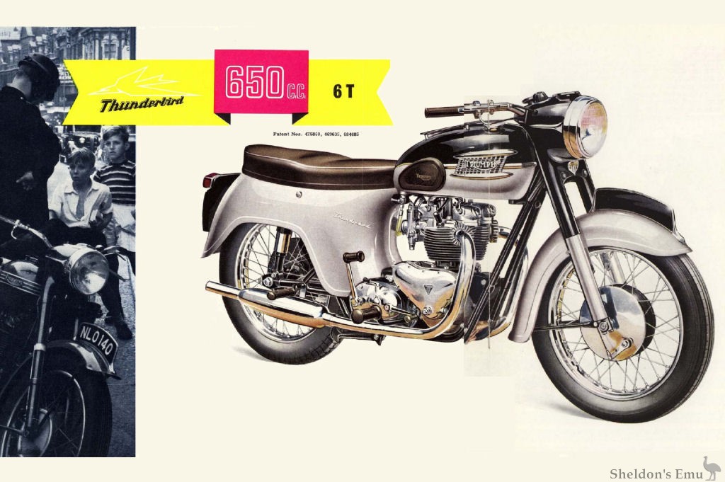 ENGINE 650 c.c. o.h.v., vertical twin with two gear-driven camshafts, Light alloy cylinder head, cast-iron barrel, high compression pistons, large bore carburetter. Splayed port head with two carburetters on T120, One-piece forged crankshaft with bolt on central flywheel. "Ef" section RB66 alloy connecting rods with plain big-ends. Dry sump lubrication with plunger type pump and pressure indicator. Gear-driven magneto with auto control. Thunderbird (6T) has A.G./D.G. lighting ignition system with emergency start circuit. Polished aluminium oil bath primary chain case. Air cleaner (not T120).
