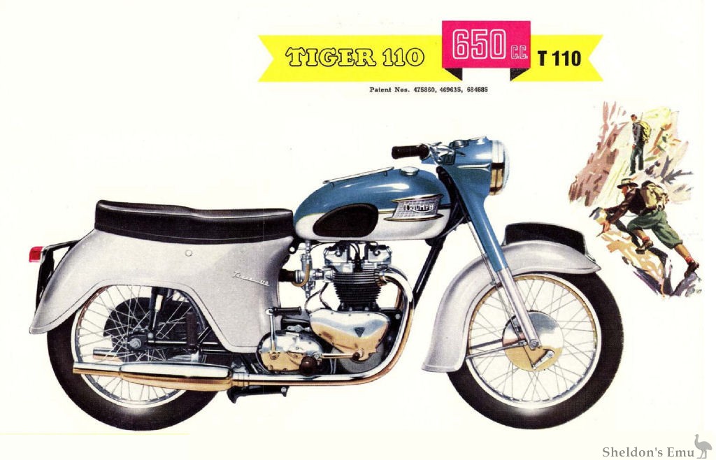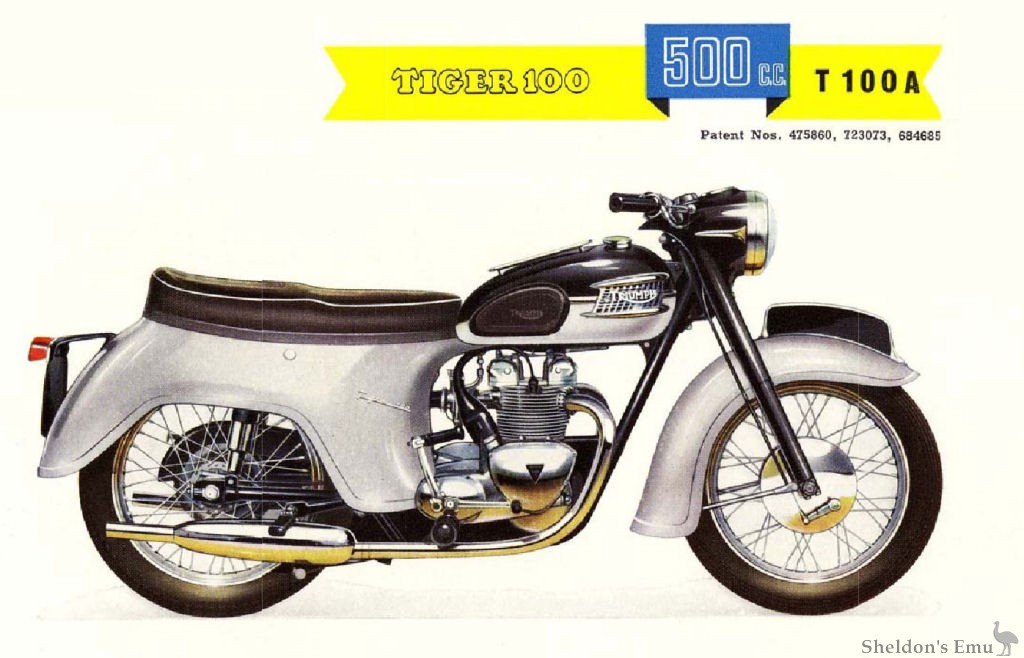 A light, easily handled 500 twin bearing a name synonymous with high performance - the Triumph Tiger 100. High compression pistons, special camshafts and many unique features - allied to modern appearance and first class handling, underline the special appeal of this model to the sporting rider.