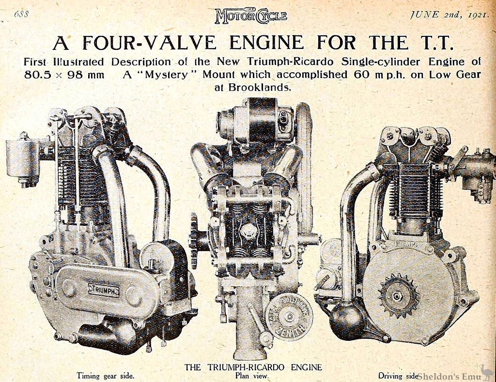 En 1921 Harry Ricardo, “el mago de la combustión” fue comisionado por Triumph para diseñar un motor deportivo de 500 cc. Con la base del motor de Frank Halford, presenta una tapa de cilindro con cuatro válvulas (paralelas de a pares y a 90°entre las de admisión y las de escape), bujía en ubicación central y un pistón de corona cóncava (soluciones que teóricamente permitían mejor aspiración, mayor compresión y un alto régimen de revoluciones)pero su diseño era bastante conservador puesto que salvo el cilindro y la tapa, el resto del motor y la ciclística eran del Model SD. Al mantener la carrera larga del modelo de válvulas laterales (80,5 x 98 mm) y tener la bujía en el centro de la tapa, las válvulas no eran de gran tamaño. Aún así en el banco dio 20 HP a 4600 rpm y,al comando de una versión racer, Halford rompe los records en Brooklands para la milla lanzada (134 Km/h), 50 millas y el de una hora promediando 123 Km/h.