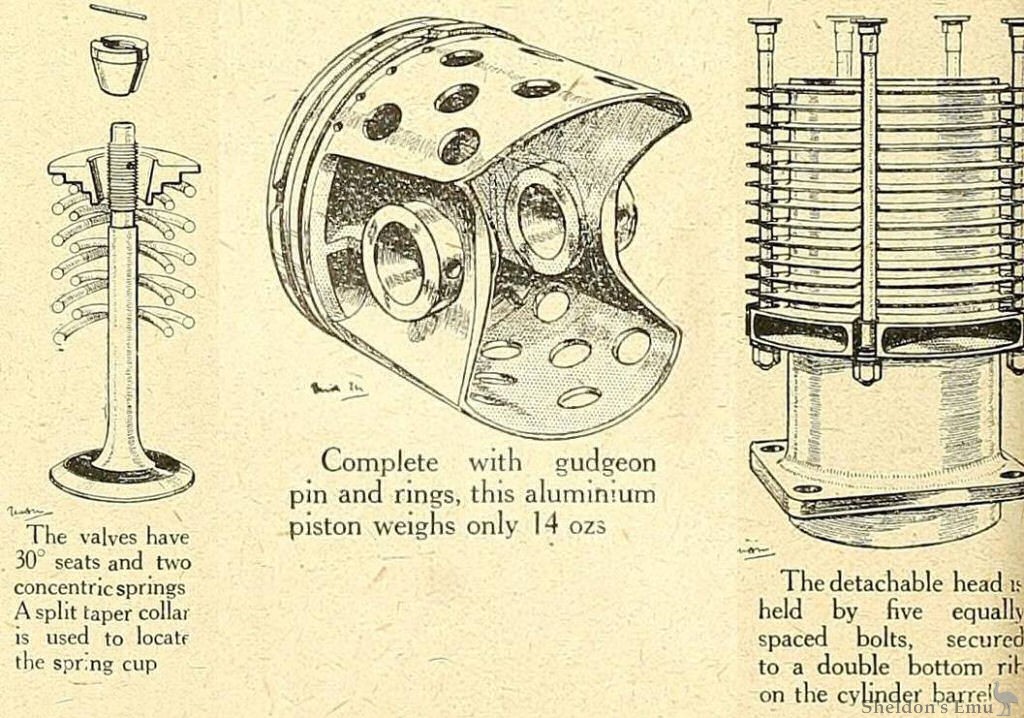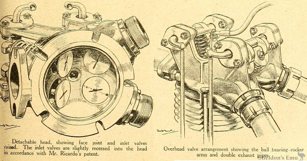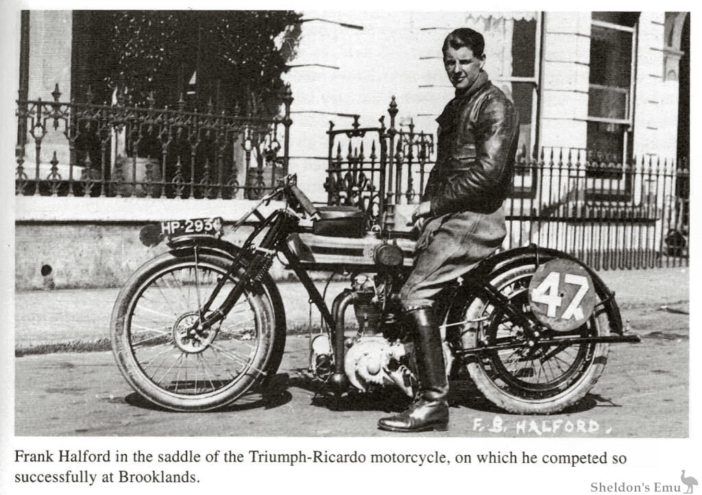 Por otra lado, después de la Primera Guerra Mundial, el diseñador de motores y piloto Frank Halford se unia a la “Compañía de Ingeniería de Investigación de Combustión Interna” de Harry Ricardo. Había comenzado a competir con Triumphs de válvulas laterales pero luego diseña una tapa de cilindro de aleación de bronce de 4 válvulas a la cabeza y fabrica un cilindro a partir de una sola pieza de acero maquinada a la que le adaptó un pistón de aluminio. En 1921, luego de instalar su motor de 4 válvulas a la cabeza en el cuadro del nuevo Modelo SD y alimentándolo con alcohol, gana varias carreras confrontando contra motos de mayor cilindrada.