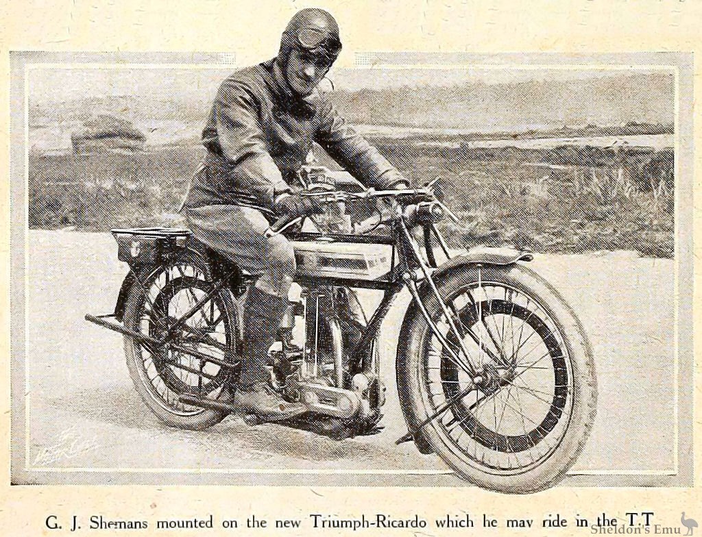 Sin embargo en el TT de ese año solo una de las tres “Riccy” logra terminar en el puesto 16, fundamentalmente debido a las deficiencias de maniobrabilidad antes mencionadas. En el TT de 1922, ya con horquillas Druids, bomba de lubricación y con modificaciones en el diámetro del cilindro (80.9 x 97 mm), Walter Brandish termina segundo a pesar de correr mas de media carrera sin la segunda marcha. A partir del año siguiente Triumph se presentaría en la Isla de Man con modelos de dos válvulas, dejando al Modelo R como la versión sport en el catálogo de la marca hasta 1927, llamándose Modelo TT a partir de 1926. Se estima que se produjeron unas 6000 o 7000 unidades.
