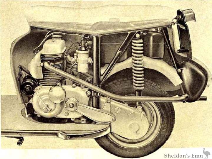 BODY Pressed steel construction beautifully styled. Completely enclosed engine and transmission and the spacious platform and front apron give very efficient weather protection Twinseat cushioned with latex foam and hinged for instant access to engine compartment and fuel and oil reservoirs, Comfortable shaped handlebars with car type instrument panel.