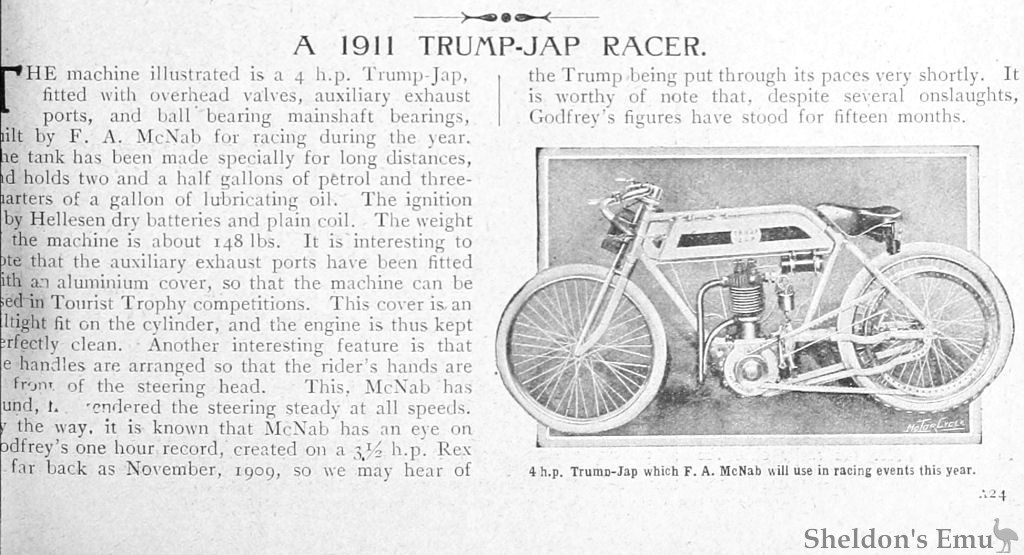 Trump motorcycles were produced between 1907 and 1923. First based in Liphook, Hampshire, they then moved to Lombard Street, Birmingham and also had the Foxdale Works, Byfleet, Surrey. The director and driving force was Frank A. McNab.