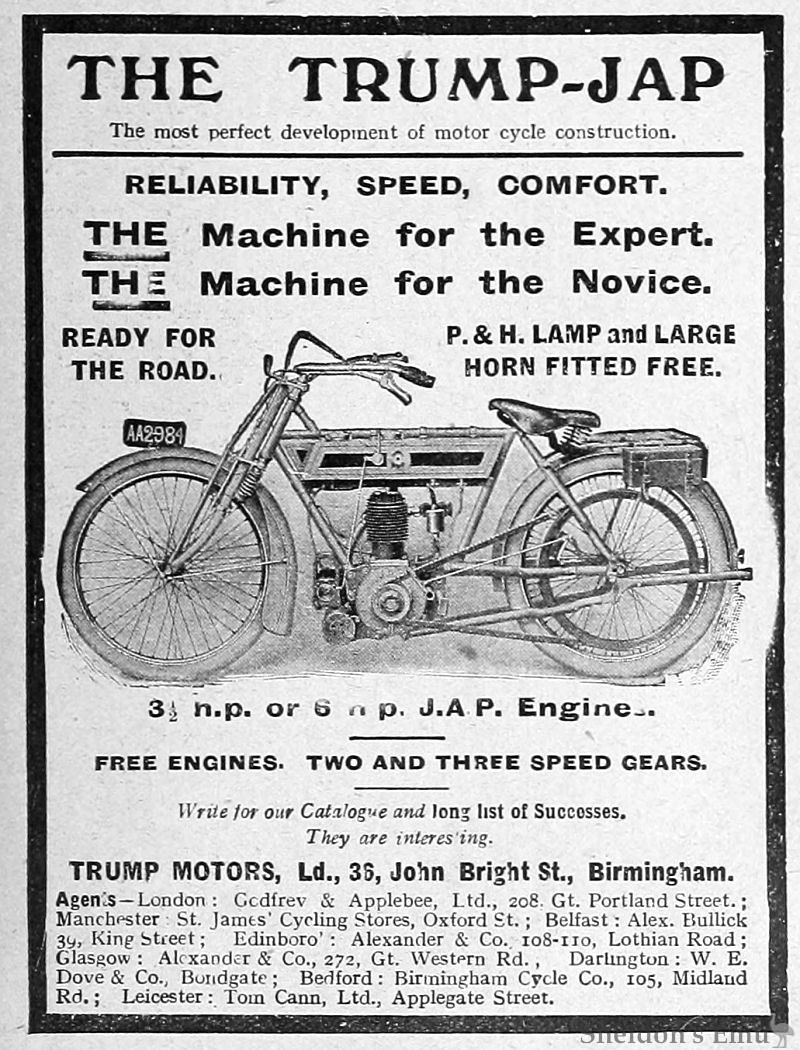 1907 The first Trump motorcycle was produced. They mainly used JAP engines and were sometimes listed as Trump-JAP.
